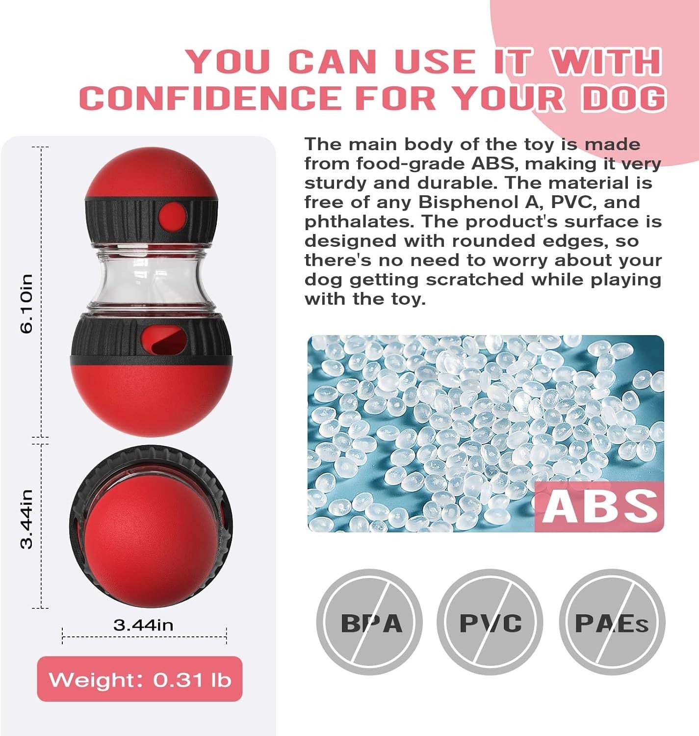 - Interactive and Engaging Play: This toy features differently sized spheres at both ends, which move within a fixed area as your dog interacts with it. As your dog pushes the toy, food is dispensed from the holes, rewarding their efforts and keeping them entertained. The movement of the toy stimulates your dog’s curiosity, encouraging them to chase and play, while the challenge of retrieving the treats makes it an excellent boredom-buster and puzzle feeder.